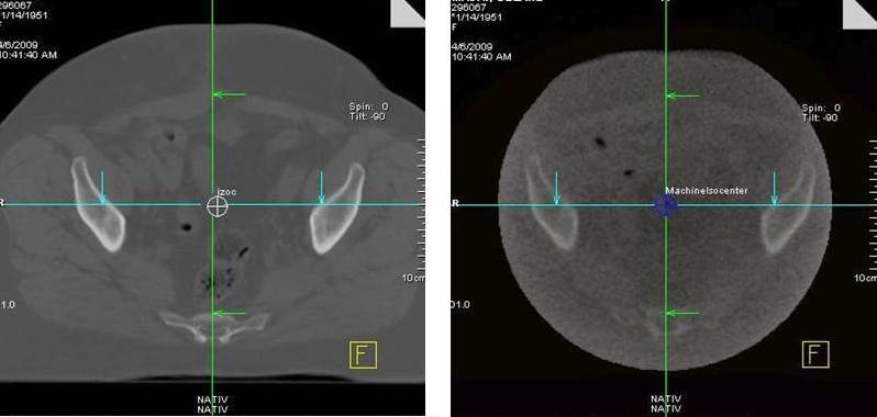 For image registration several different procedures can be used. The most common process is the automatic image registration on the base of bone structure. Soft tissue fusion can be made with kV CT or CBCT imaging. This is of great significance because the majority of tumours are soft tissue. Of course, manual image registration can be performed with each system, but this is time consuming and highly subjective. Image registration with EPID is available only with reference markers (mostly 3 gold markers), which must be placed onto rigid anatomical sites using a surgical procedure. They are clearly identified by EPID and portal image can compare with DRR. The displacement vector can be determined by using markers. This is necessary for set-up correction. The verification images are usually made in two directions (anterior-posterior and lateral).